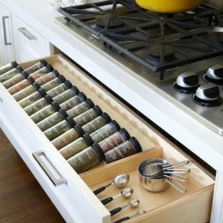 This is the area designated for the hob and for cabinets housing pots, pans, spices, cooking utensils and all other items necessary for the cooking process. Images below illustrate some well-designed, practical storage solutions. As already mentioned, when designing any kitchen I would recommend the usage of drawers, and this area would be no exception. The images below are just some of the ways these drawers could be utilised to facilitate easy access to everything needed while standing at the stove. And, if well organised, these drawers can really maximise all the space available, thus fitting and housing much more than would be possible on shelves within a cabinet.